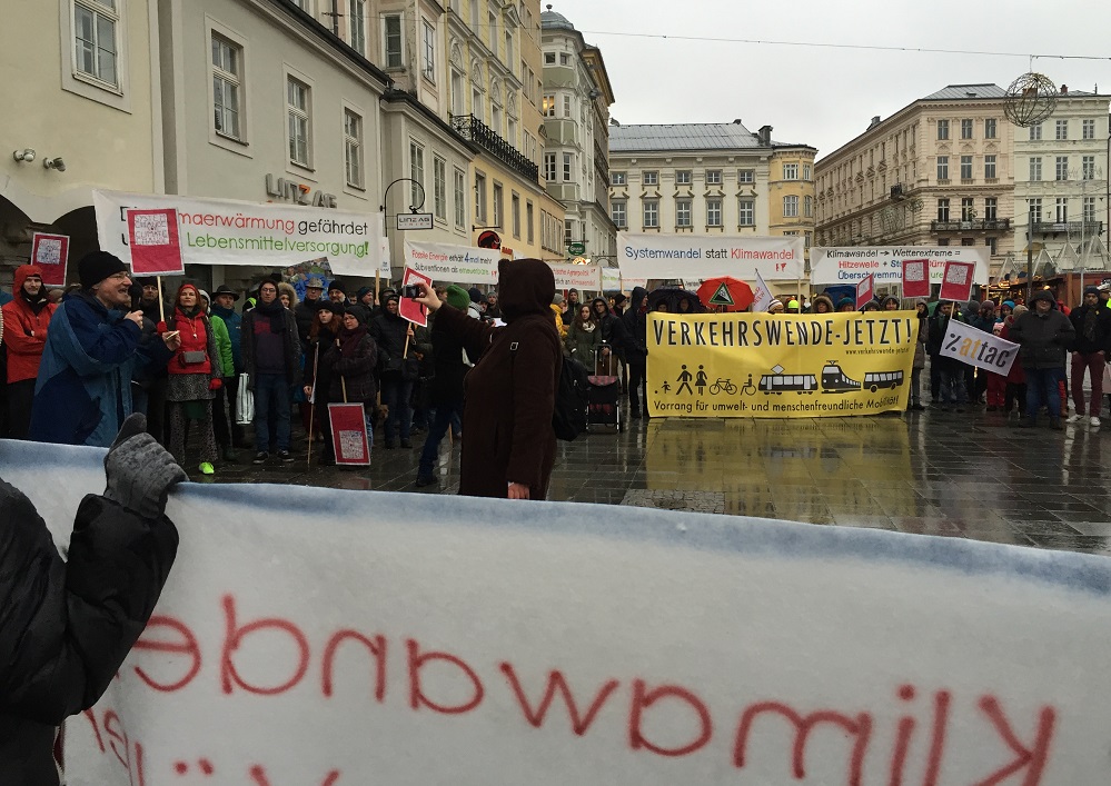 9_IMG_5587Gestern bin ich mit den etwa 300-400 Weltklima-Bewegten vom Volksgarten durch die Landstraße zum Hauptplatz mitgegangen, habe Gespräche gesucht und an Passanten die 12 Punkte Forderung verteilt. In anderen Erdteilen sind es Zig-Tausende, die die Weltverantwortlichen aufrütteln wollen. In den Gesprächen am Rande des Gehens wurden mir wieder einmal bewusst, wie klar den Leuten die Situation ist und wie passiv sie dabei bleiben, der größten Sünde verfallen: „Was kann ich da schon machen?“ Ein Mitgeher hinter dem Transparent „Der Klimawandel führt zwangsläufig zur nächsten Völkerwanderung“ meinte recht schlüssig: „Es drängt und alle gehen einkaufen“. Die Ablenkung gelingt. Eine Frau mit Einkaufskorb und dickem Pelzmantel: „Tut’s endlich was und blockiert’s hier nicht die Straße.“ „Was kann ich schon machen?“, meinte eine Frau mit dem Enkelkind in der Hand. „Ich fahre fast ausschließlich mit Öffis. Jeder auch noch so kleine Schritt zählt“, ist meine Ermutigung an sie. Hinter uns geht das Transparent „Verkehrswende jetzt“ vorbei. Politiker rollen Straßen aus und mehr Autos stehen weiter im Stau. Mit jeder neuen Straße mehr Autos. Wo bleiben die wirklichen Investitionen in den Öffi-Verkehr? Die Auto-Lobby fährt mit den Politikern und den Medien nur so spazieren, auf Kosten der Umwelt, der Mitwelt und der Zukunftswelt.