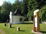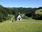 Eine Frau hat am Weg zu uns gemeint: „Jetzt mit dem Johannesweg gehen mehr Leute mit Rucksack.“ Klar. Sie sind drei Tage unterwegs und da packt man einiges ein. Sparsam, wenig, aber doch braucht es den Rucksack. An diesem erkennen wir unsere heutigen Mitpilger, die ihren Johannesweg am vorgesehenen Start in Pierbach „angehen“. Sie sind einmal vor uns und dann wieder hinter uns. Unser Weg führt uns auf der Straße hinaus zur Abzweigung „hinüber zum Irxenmayr“, wo die Eröffnung stattfand. Der Johannesbrunnen und die Engelskapelle mit ihren Johannes-Stämmen sind ein unvergesslicher Platz. Wir trinken und waschen uns den Schweiß nicht nur von der Stirn. Die Sonne steigt und „wärmt“. Wir gehen wieder hinunter ins Tal und entlang des Baches hinauf nach Schönau, wo wir um 12.15 Uhr ankommen. Die Kirchenglocken habe wir beim Hinaufgehen gehört. Dort versperrt uns das „Dorffest“ den Weg. In der kühlen Kirche halten wir inne und stärken uns zu zweit mit einem Grillhenderl. Sollen wir das überhaupt essen? Ja, es hat gut getan. Schöne Gespräche beim Ankommen dort lassen wir bei uns nachwirken. Eine Dorfgemeinschaft begegnet uns, die wir auch von daheim kennen. Es heißt aber weiter und laut Karte haben wir noch einige Höhenmeter vor uns. Es geht kontinuierlich nach oben. Der Aufstieg entlang der Speedgleitbahn zum Herrgottsitz fordert mentale Stärke, weil es die Mittagssonne mit uns sehr gut meint. Nach den mehr als 200 Höhenmetern erwartet uns allerdings ein wunderbarer Ort.