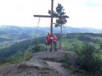 Um 17.15 Uhr machen wir uns zur letzten Etappe dieses Tages auf. Immer wieder haben wir „Gipfelkreuz“ gehört und nicht gewusst, wie und was. Der Weg führt uns leicht hinauf und wieder leicht hinunter bis zum kurzen steilen Anstieg zum Gipfelkreuz. Ein wunderbarer Platz mit einer wunderbaren Aussicht. Im Tal unten liegt Königswiesen unser Tagesziel. Ein Radfahrer aus Wien ist zur gleich Zeit oben und so machen wir jeweils voneinander Fotos. Wir sind uns einig: Ein Gipfelerlebnis mitten im Mühlviertel auf 920 m. Wir sind dankbar, hier zu sein und es drängt uns gar nicht talwärts. Es muss aber sein. Nach einem Abstieg von 920 m auf 610 m erreichen wir Königswiesen um 19.15 Uhr. In der Kirche ist gerade der Abendgottesdienst und wir beten das Vater unser mit. 9 1/2 Stunden Gehzeit liegen hinter uns. Das Wetter war uns wohlgesonnen. Shorty wird wieder daheim sein. Wir genießen in trauter Zweisamkeit den Gastgarten der Karlingers und lassen den Tag nochmals vorüber ziehen. Wir sehen ihn als großes Geschenk. Der Hunger ist „vergangen“ und so brauchen wir nur eine Kleinigkeit. Wer geht, braucht weniger Essen. Es war anstrengend – aber nährend. Die Kraft kommt im Gehen. Wir gehen bald ins Bett, den der morgige Tag beginnt um 4.15 Uhr.