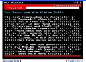 Es berührt mich, was derzeit über die Teletextseiten wandert: Die kleine fünfjährige Sofia wittert ihre Chance und durchbricht die Absperrungen in Richtung Papst Franziskus. So wie es schon in der Bibel geschildert ist, sind die Ordnungshüter sofort zu stelle und weisen das Kind zurück. Zu spät. Der achtsamen Wahrnehmung des Papstes ist es nicht entgangen, …