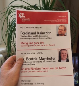 Plakate kündigen uns an. Das STADTFORUM des kbw Salzburg hat uns eingeladen. Unsere Themen sind „Mutig und ganz Ohr“ und „An den Rändern finden wir die Mitte“. Mein Untertitel verrät „Die notwendigen Schritte einer Kirche der Zukunft“ und der zweite Untertitel lautet „Wo sich Christsein bewähren wird“. Ich kenne den Markussaal in der Gstättengasse 16 …