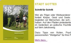 „Wer weit geht oder sich auf eine Pilgerwanderung begibt, fordert nicht nur seinen Körper. Das Gehen hat auch eine mentale und spirituelle Dimension.“ Das ist meine Erfahrung, die ich in der aktuellen Ausgabe der Stadt Gottes beschreibe. Diese wirklich gut gemachte Zeitschrift geht an etwa 70.000 Leserinnen und Leser. Sie wird von den Steyler Missionaren …