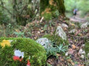 Etwas umgekehrt oder verkehrt anzugehen, ist keine leichte Übung. Schon die Entscheidung dazu. In diesem Fall waren die Markierungen immer auf der „anderen Seite“ des Baumes, des Mastens. Bei einer Gabelung, wo die Normalrichtung ankommt, ist nicht gleich weitermarkiert. Es ist dann ein besonderes Suchen und machmal auch Versuchen, ob das der Weg sein könnte. Es ist ein Gehen „mit Rückspiegel“ und dem Einsatz der Intuition, wo der Weg sein könnte. Es ist mühsam, verunsichert, braucht Umwege und ein tiefes Gespür und Vertrauen in das Geführt-Sein. Es ist aber eine gute und wertvolle Übung. Der Mainstream der Gesellschaft braucht dieses „verkehrt“ gehen mehr denn je. Es erhöht die Aufmersamkeit, bietet andere Perspektiven und die Menschen kommen dir entgegen. Begegnungen sind Begegnungen. Die Anzahl der Gespräche steigt, das Wissen über Unterkünfte können wir schon am Weg mit denen austauschen, die von dort kommen, wo wir hingehen. Die Tipps gehen hin und her. Wir haben keine Unterkünfte reserviert und doch jeden Tag eine gefunden. Manchmal habe ich an Pippi Langstrumpf gedacht: Sie ist auch immer verkehrt am Pferd gesessen und hat ganz andere „Sichten“ gehabt als alle anderen. Nur Mut dazu.