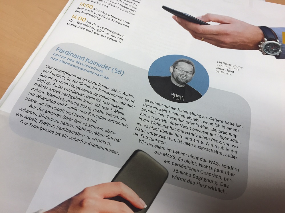 So habe ich es Anfang Oktober formuliert: „Das Smartphone ist de facto immer dabei. Außer: Am Esstisch, in der Kirche, im Schlafzimmer. Beruflich ist es mein Hauptwerkzeug zusammen mit dem Laptop. Es ist wunderbar, dass ich fast überall (siehe Netzzugang) meiner Arbeit nachgehen kann. Ich lese Emails, schaue Websites, mache Fotos, drehe Videos, bin mit WhatsApp mit Familie und Freunden verbunden, poste auf Facebook und twittere mit. Auf der anderen Seite fällt es schwer, abzuschalten, Distanz zu halten, nicht im zähen Einerlei von Arbeit, Freizeit, Familienleben zu ertrinken. Das Smartphone ist ein scharfes Küchenmesser. Es kommt auf die Handhabung an. Gelernt habe ich, dass ich kein Telefonat abhebe, wenn ich in einem persönlichen Gespräch oder in einer Besprechung bin. Ich schalte über Nacht bewusst auf Flugmodus. In der Wohnung hat das Handy einen Platz, von wo ich es nicht überall höre und sehe. Wenn ich in der Natur unterwegs bin, ist alles ausgeschaltet außer der Fotoapparat. Wie bei allem im Leben: Nicht das WAS, sondern das MASS. Und gesellschaftlich entwickelt sich die digitale Welt aus meiner Sicht mehr zum Fluch denn zu Segen. Es bleibt: Nichts geht über ein persönliches Gespräch, persönliche Begegnung. Das wärmt das Herz wirklich.“