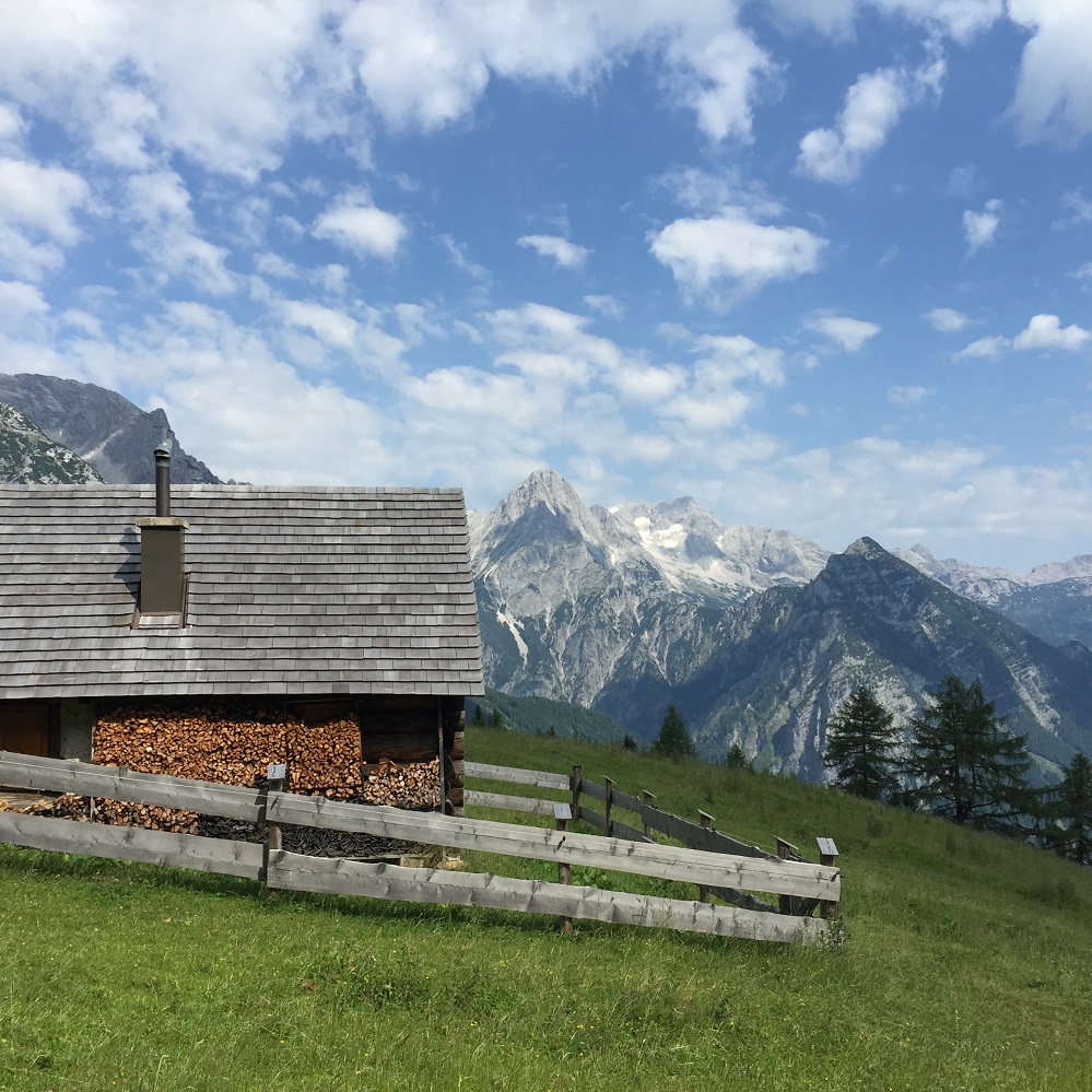 Der zuerst gemütliche Forstweg geht nach etwa 10 Minuten in den steilen Anstieg über durch den Wald hinauf. Dort eröffnet sich der erste weite Blick. Ein ausgetretener Pfad führt auf einen vorgeschobenen Felsen. Dort rate ich kurz hinaufzugehen, weil damit das für viele so wichtige „Gipfelerleben“ abgedeckt wird. Da gibt es am Normalweg keine zweite Chance. Der Weg ist auf der ganzen Strecke schön angelegt und recht risikolos zu gehen. Schwindelfreiheit und Trittsicherheit sind mitzubringen. Besondere Plätze tun sich auf bei den beiden Hütten am Weg. Gerade die Lögerhütte ist für fotografische Augen eine „Augenweide“. Hier lohnt es sich, einfach nur zu schauen. Bewirtung gibt es keine. Braucht es auch nicht. Das Panorama hinüber auf die Spitzmauer, Großer und Kleiner Priel hinunter ins Tal ist: einfach herrlich. Der Bauer bittet auf einer Tafel beim Eintritt in die Almweide, ihm ein SMS zu schicken, wenn wir die 12 Rinder sehen. Wir haben sie gezählt und die Nummer nicht aufgeschrieben. Eine lustige Wahrnehmungsübung für „Hobby-Almer“.