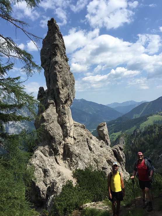 Entlang der „Dolomitenfelsen“ schlängelt sich der Weg „hinüber“ Richtung Salzsteigjoch. Einfach schöne Plätze, Wasser fällt herunter, Tümpel laden direkt zum Baden ein und früher oder später sitzen wir am Weg, genießen das Mitgebrachte und die wunderbare Aussicht. Über eine lange Schotterriese geht es wieder hinuter ins Tal. Mit einem 5-Minuten-Abstecher stehen wir im Steyr-Ursprung. Auch das immer wieder ein Naturschauspiel. Das Wasser kommt aus den Steinen und macht innerhalb von 10 Metern einen imposanten Bach. Bevor wir die Heimreise antreten, gilt es noch einzukehren in Almgasthof. Kinder fühlen sich dort wohl, weil Platz und natürliche Spielmöglichkeiten sind. Wir waren gemütlich 4 1/2 Stunden unterwegs. Ein schöner Sonntag den „Stoderer Dolomiten“ entlang.