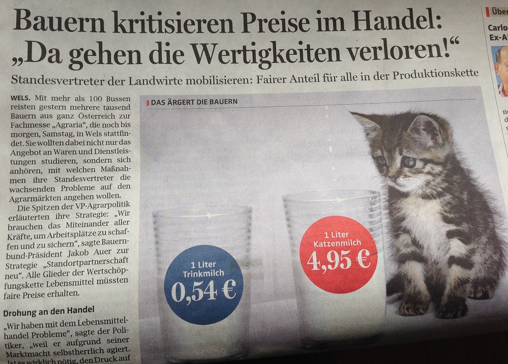 Da nimmt man das Flesserl, streicht Butter hinein. Fertig ist es. Der Kaffee dazu. Die Zeitung lockt. Klar ist, dass der Geschmack des Flesserls den Inhalt der Zeitung übertrifft. Deshalb keimt der Zweifel auf, ob ich überhaupt die Zeitung „dazulesen“ soll. Ich blättere. Dann die Headline: „Bauern kritisieren Preise im Handel. Da gehen die Wertigkeiten verloren!“. Ein Bild (siehe Bild) sagt mehr als tausend Erklärungen. Die Katze schaut auf ihre Katzenmilch zum Preis von 4,95 EUR. Daneben steht die Trinkmilch im Glas mit 0,54 EUR. Das ist kein Tippfehler. Und ich frage mich beim Frühstück wieder einmal: Was ist los mit unserer Welt? „Geiz ist geil“ hat in den meisten Menschen das „gute Verhältnis, die Wertigkeiten“ tiefgehend zerstört. Es ist der Preis, der die Gefühle im Verhältnis zum Wert steuert. Billig ist gut. Billigst ist hervorragend. Ich schaue seit Jahren keine Werbung mehr an, die mit den Zeitungen geliefert wird. Ich lasse mir meine Wertigkeitsverhältnisse, die ich an der Natur und der Nachhaltigkeit ausrichten will, nicht durch „Sonderangebote“ zerstören. Heini Staudinger sagt: „Die Milliardenindustrie Werbung redet uns täglich ein.“ Hier zum Nachschauen. Zurück zu unserem Bäcker. Gut, dass ihr Brot backt, hier für uns im Bergdorf und weit über Kirchschlag hinaus. Brot und keine aufgebackenen Teiglinge. Ihr seid deshalb nicht die billigsten, aber die besten.