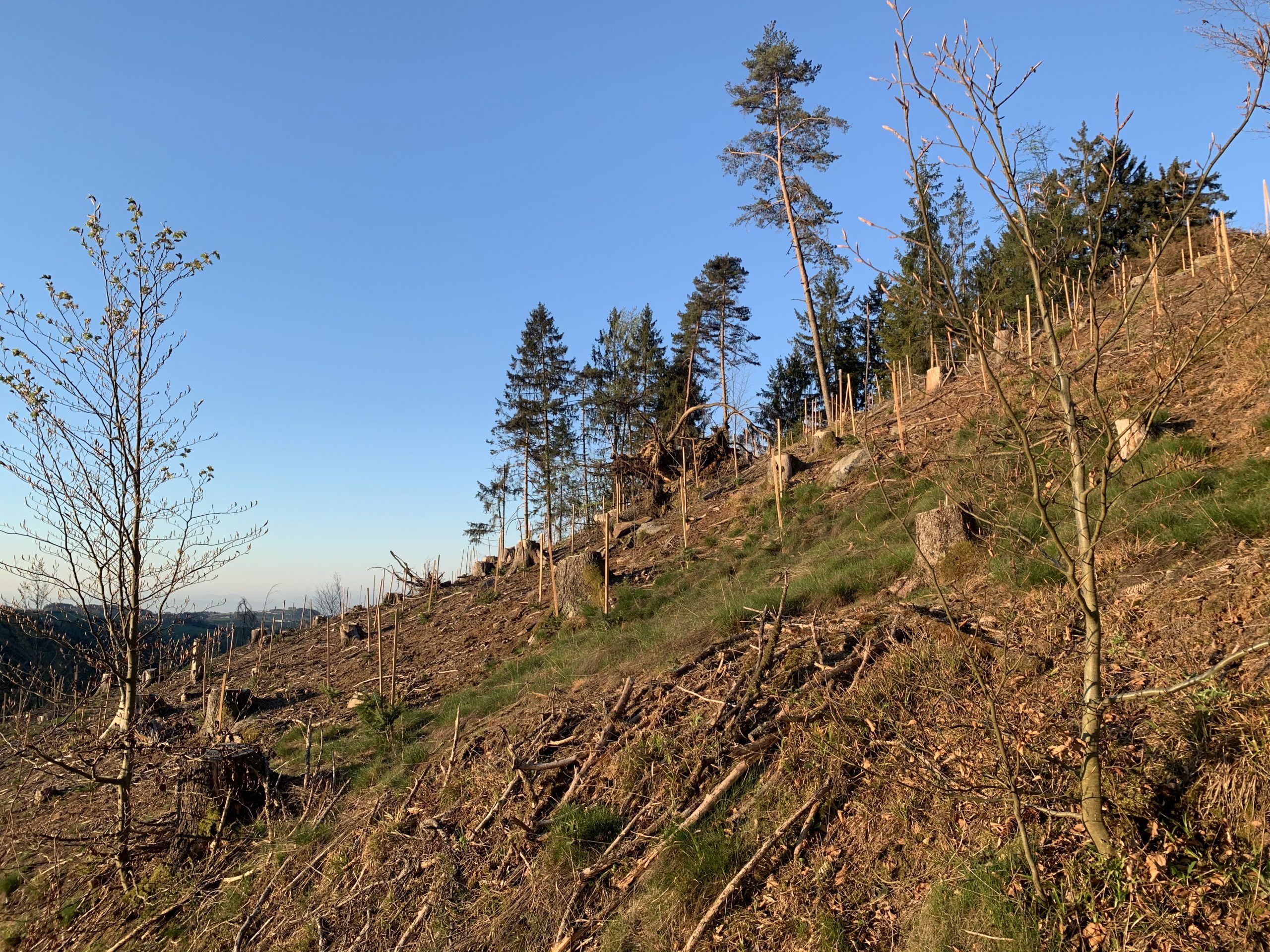 Meine gehende Morgenrunde führt mich normalerweise zuerst weit hinunter und dann wieder zurück herauf. Hätte ich die Schier angeschnallt, wäre die Abfahrt einfach toll, schön steil und der Sonne entgegen. So gehe ich per Pedes am Schilift vorbei hinunter bis „in den Graben“ (Haselgraben), vorbei an den Baumstümpfen der dort einmal gestandenen Bäume. Der Borkenkäfer hat die Motorsägen aktiviert.