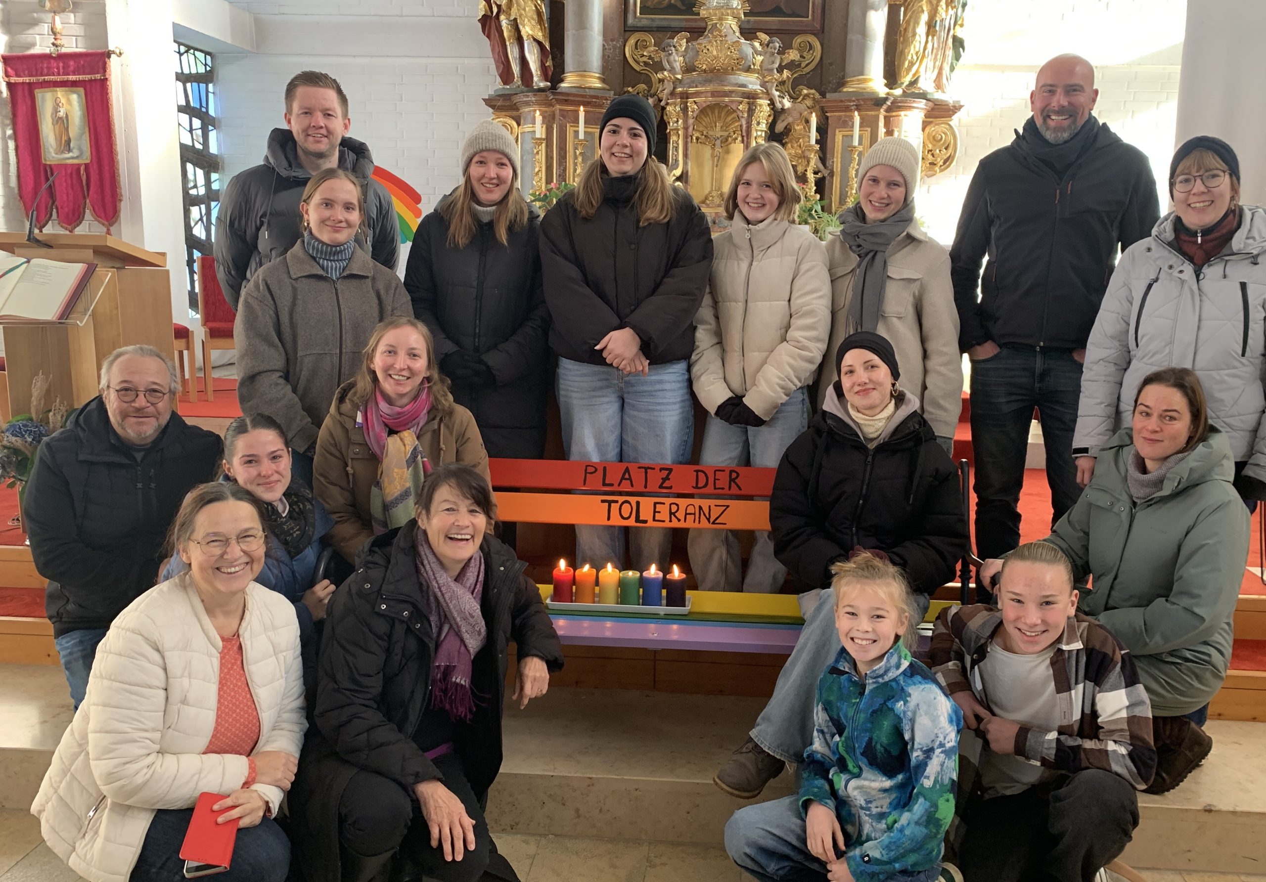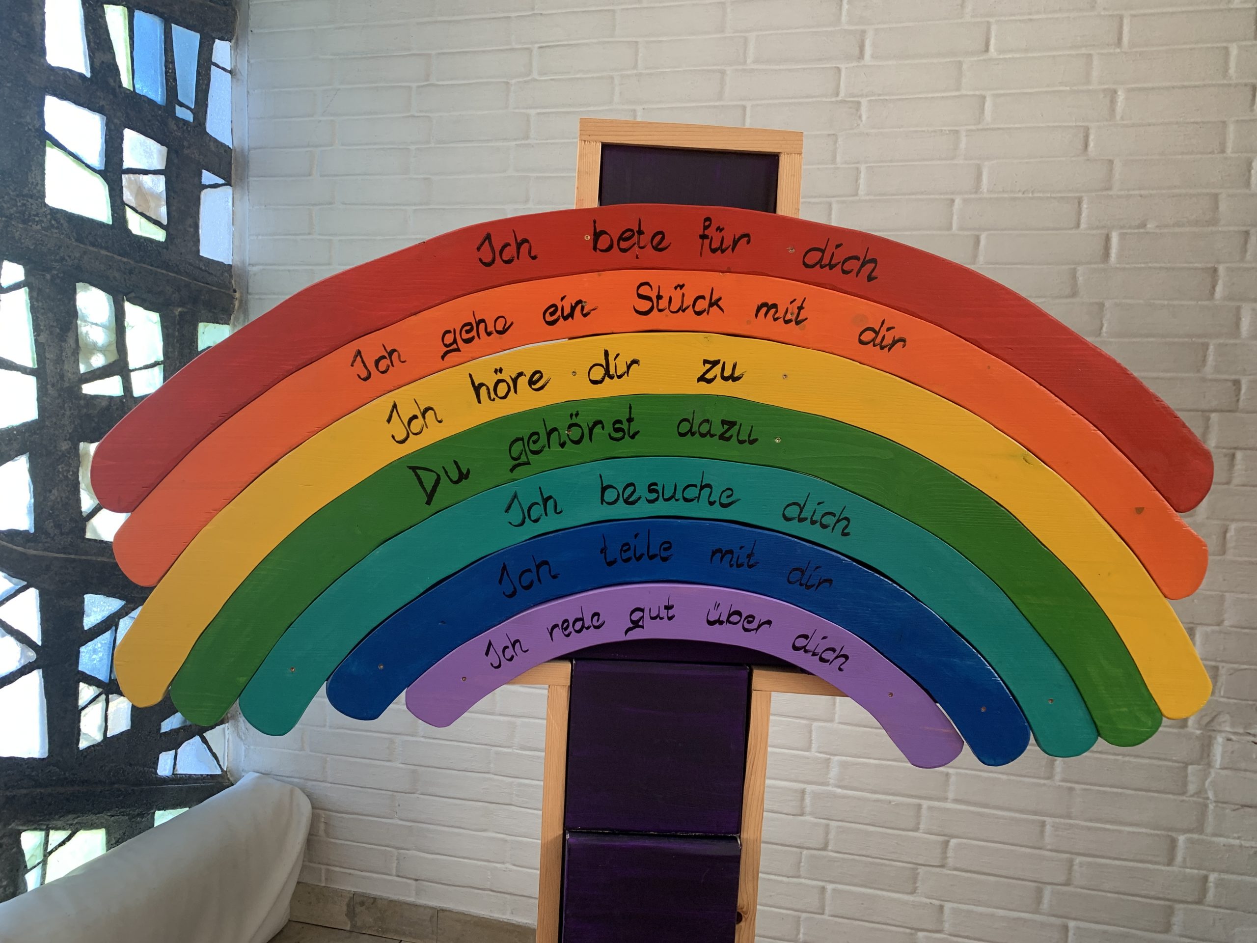 „Platz für Toleranz“ nennen die Jugendlichen in Kirchschlag jenes Bankerl, das am Christkönigssonntag bei der Jugendmesse im Mittelpunkt stand. Der Regenbogen ist das Zeichen Gottes am Himmel für Vielfalt und Unterschiedlichkeit, jede und jeder mit ihrem und seinem unendlichen Wert. Der Regenbogen steht für alle Lebensformen, die im Schöpfungsplan vorgesehen sind. Dort heißt es nämlich: „Und alles ward sehr gut.“