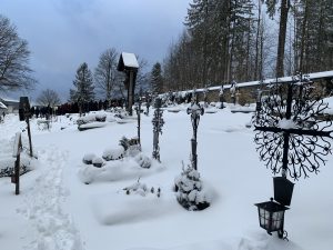 Es geht bergauf. Beim Hineingehen in den verschneiten Friedhof sehe ich die Steinmauer des Mittelweges, die er mit einigen Männern neu errichtet hat, weil die alte Mauer nicht hielt. Den Beton haben wir damals beim Pfarrzentrumsneubau „abgezweigt“ und die Steine hat er zusammengesammelt. So entstand der naturnahe Grasweg zwischen den Gräbern. Er hat Immer eine Lösung gesucht, die im Sinne des Gemeinwohls war. Eigennutzen war ihm fremd. Und er hat die Lösungen getan. Tun war seine Leidenschaft. Mit anderen und für andere. Und hier könnten viele Dinge angeführt werden, die er immer zusammen mit anderen umgesetzt hat. Das war in der Familie so, in seiner beruflichen Tätigkeit und genauso im Bergdorf und darüber hinaus. Was waren das für Zeiten für die ganze Dorfgemeinschaft als er mehrmals das Stadl-Theater am Elternhaus betrieben hat.