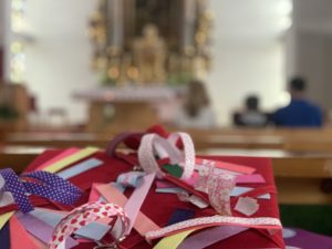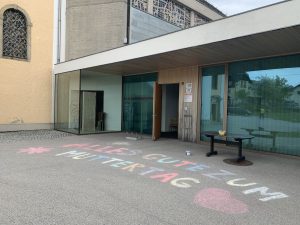Am Muttertag empfängt uns in großen Lettern vor dem Eingang am Asphalt gemalt „Alles Gute zum Muttertag“ mit einem großen Herzen dran. Der Kinderlitugiekreis war initiativ. Der Kirchenraum mit Vorplatz atmet ein gemeinsames Suchen in dieser „ver-rückten Zeit“. Es lohnt sich, dort hinzugehen, wem das Gehen möglich ist. Diese Form der Gottsuche sollten wir einander in Achtsamkeit und Verbundenheit weiter schenken, auch wenn hoffentlich bald die haptischen Begegnungen, das gemeinsame Singen und Beten wieder möglich sein werden.