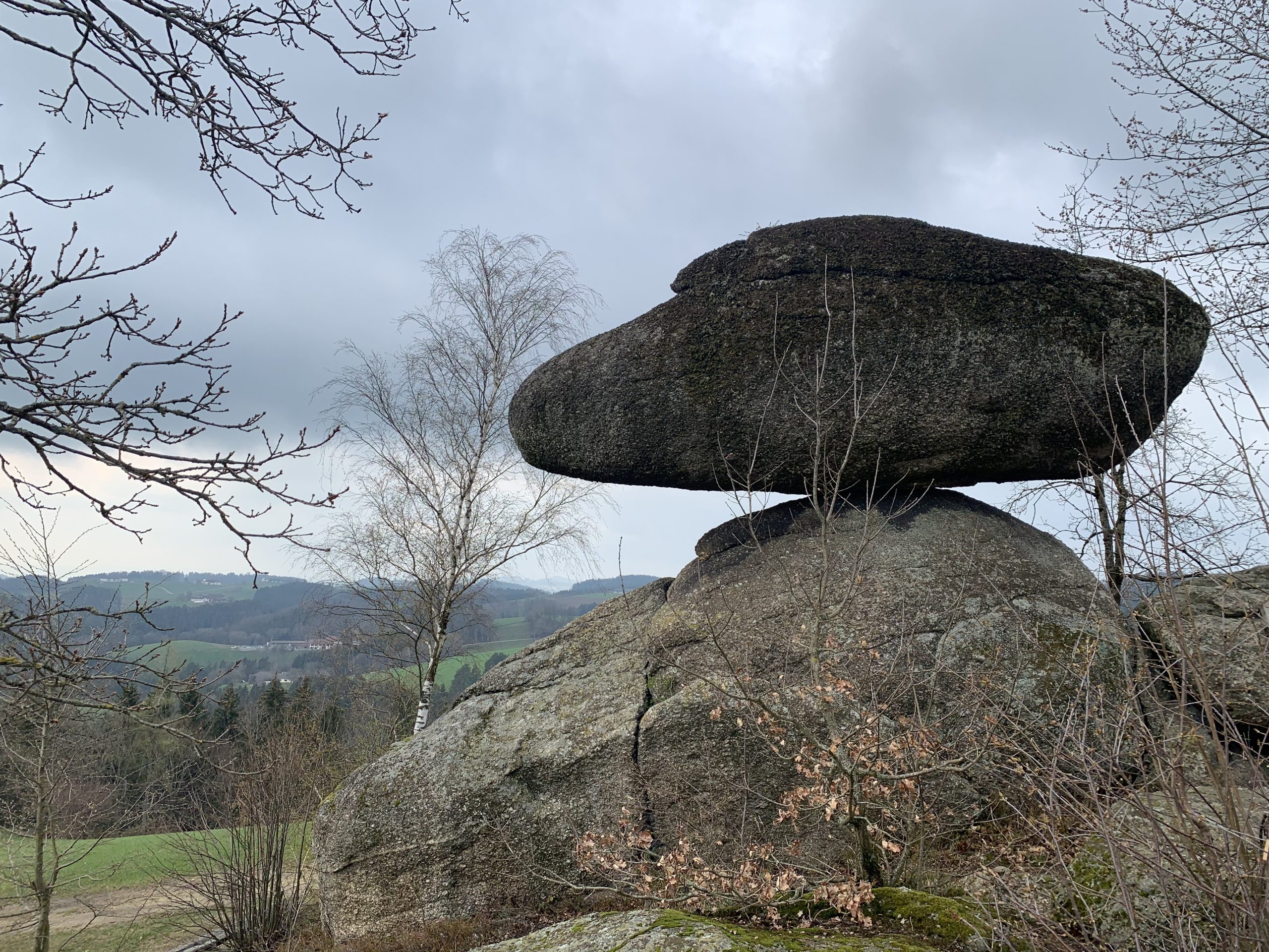 In die Balance gehen, ist mir spontan zu meinem Gehen und Pilgern im Mittelland eingefallen, als ich heute vor dem Wackelstein in Rechberg gestanden bin. Staunend stehe ich davor. Puuhh. Tag fünf. Eine Tafel zeigt, dass im Franzosenkrieg die Soldaten versucht haben, den Stein aus seinem Gleichgewicht zu bringen. Ihr Versuch ist gescheitert, hat aber dazu geführt, dass der Stein jetzt fester „sitzt“, festere Balance gefunden hat.