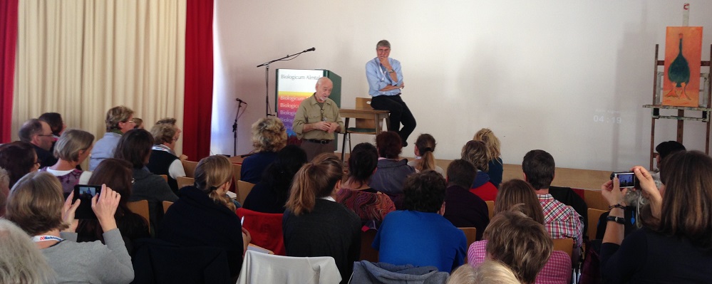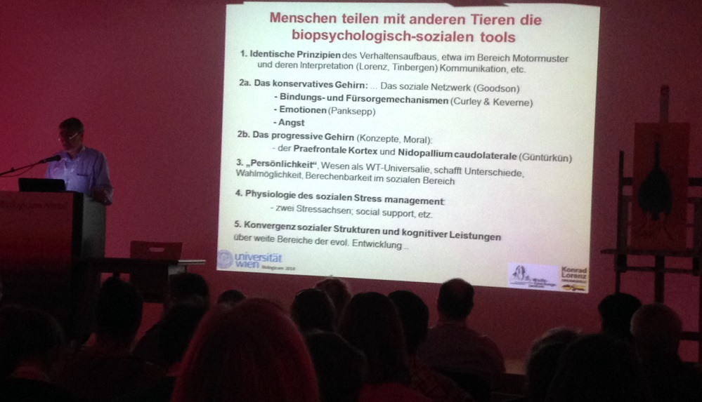 „Gefühle sind nicht dem Menschen vorbehalten. Tiere haben Sorgen und Freuden.“ Jaak Panksepp steht auf der Bühne und referiert beim 1. Bilogicum Almtal über die Gefühlswelt bei Tieren und Menschen. Ich höre intensiv zu und nehme mir von dem international renommierten Psychologen mit, „dass animal mind gute Auskunft gibt über den Menschen selber.“ Gefühle sind im Stammhirn angesiedelt und diese Hirnbereiche sind bei Mensch und Tier als dieselbe Basis vorhanden. „Tiere und Menschen haben dieselbe emotionale Basis. Mensch und Tier teilen dasselbe emotionale System.“ Panksepp erzählt (auf englisch) von verschiedensten Versuchen, Beobachtungen und Messungen, die das belegen. Er wiederlegt auch die seit Rene Descartes aufkommenden Thesen und Arbeitshaltungen, dass Gefühle entweder irrelevant, im Großhirn angesiedelt sind oder dass man dazu nichts sagen kann. Mit eindrucksvoller Einfachheit und Klarheit lässt der Psychologe keinen Zweifel daran, dass Mensch und Tier auf derselben emotionalen Basis aufbauen. „Das erklärt auch, dass ein Hund ein Kind ersetzen kann.“ Mir gehen viele Gedanken durch den Kopf darüber, wie heute der Mensch durch (Haus)Tiere seine emotionale Balance finden will.