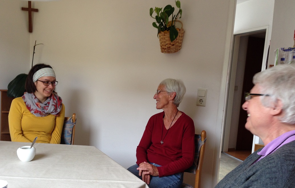 _35woman_33Helferinnen1„Wir haben keine Einrichtungen, sondern gehen dorthin, wo wir gebraucht werden. Wir sind dadurch sehr flexibel.“ 1856 hat die Gründerin Eugénie Smet die Menschen gesehen, die unter seelischer Not litten. „Heute widmen wir uns durch verschiedenste Begleitung vor allem jenen Menschen, die in schwierigen Situationen und in einem Läuterungszustand sind.“ Wir leben deshalb ganz einfach und nach außen nicht als Ordensfrauen „gleich erkennbar“. In der Küche raschelt es. Claudia, seit einer Woche Gast aus Deutschland, ist gekommen und fängt an zu kochen. Sie setzt sich zu uns. Sie hat ihre Lehrerinnen-Ausbildung fertig, schätzt die ignazansiche Spiritualität und hat eine Helferin in Erfurt persönlich kennen und schätzen gelernt. Sie will das gemeinschaftliche Leben hier kennenlernen. Sie ist davon angetan, dass die Helferinnen „am Lebensstil und daran, was sie wie tun“ erkennbar sind. „Die Menschen sehen nicht im ersten Moment die Nonne oder geben ihr einen Stempel.“ Wir nehmen die beiden Videos auf, eines mit Sr. Ute im Esszimmer und eines mit Claudia vor dem Haus. Für das JAHR DER ORDEN nehme ich das unglaublich konsequente Einstehen für die Menschen am gesellschaftlichen Rand mit. Für mich war das heute der „Diagonal-Sprung“ ins andere Eck der vielfältigen Ordenswelt, vom Stift in die einfache Wohnung mitten in der „Vogelsiedlung“ in Salzburg._32DonBoscoHaus