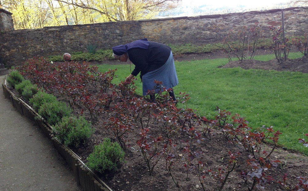 Bis Mitte der 1930-er Jahre war das Schloss verkommen, nachdem Josef II die Benediktinerabtei 1783 aufgehoben hat. „Die Leute aus der Gegend haben Brennnesselschloss dazu gesagt“, weiß Sr. Lucia. „Die Schwestern haben es dann übernommen und seitdem mit viel Arbeit und gemeinsamen Engagement aufgebaut“, weiß man an der Pforte. Die Schwestern haben selber immer auch Hand angelegt. So wurde aus dem verfallen Schloss ein wunderbarer Ort für Gäste. Bei mir denke ich: Diese absichtslose Gastfreundschaft ist das, was der digitalisierte Mensch heute wirklich braucht. Irgendwie habe ich bei meinem Blick rundum und beim Hinhören das Gefühl, dass hier ein Gesamtkunstwerk der Gastfreundschaft gelebt wird. Offen auf Gott und den Menschen hin. Eine Schwester pflegt mit ihren 85 Jahren den Garten, den wir als Gäste nutzen können. „Diese Aufgabe macht mir immer noch großen Spass“, betont sie angesichts der Rosen, die in der aktuellen Kälte etwas leiden.