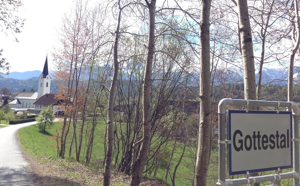 Ich denke: Das Nomale, das Alltägliche kann zum Besonderen werden. Brot und Wein werden Liebes- und Lebenszeichen. Die Videos mit Sr. Monika und Sr. Johanna nehme ich im Hof und auf der Terrasse auf. Dann packe ich meinen Rucksack, gehe noch in die Kirche, die durch die Schmucklosigkeit des Karfreitags strahlt und nehme einige Produkte aus dem gut besuchten Klosterladen mit. Rund herum das Bemühen um eine “faire Welt“. Mein Weg führt zum Bahnhof Föderlach. Ich gehe durch „Gottestal“ und frage eine Frau, woher der Name des Dorfes kommt. Sie weiß es nicht. Der Name und Ort veranlasst mich zu einem Tweet mit Foto: „Gott selbst ist heute ins Tal gegangen. Gottestal.“ Der Karfreitag wird im Zug über und durch die Alpen begangen. Beim Abschied wusste ich schon: Wir kommen wieder.