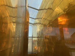 Es ist ein goldener Spalt, der zwei Räume verbindet. Auf der einen Seite der spirituelle Raum der St. Anna Kirche und auf der anderen die Community-Räume des Pfarrzentrums. Durch den etwa einen Meter breiten Spalt fällt das durch die Messingplatten vergoldete Licht des Himmels hinunter in die Aufbahrung. Leben, Licht, Strahlen begegnet dem Sterben, dem Abschiednehmen, dem Vergänglichen. Die Emmausgeschichte und die „Versöhnung“ prägen den Zwischenraum.