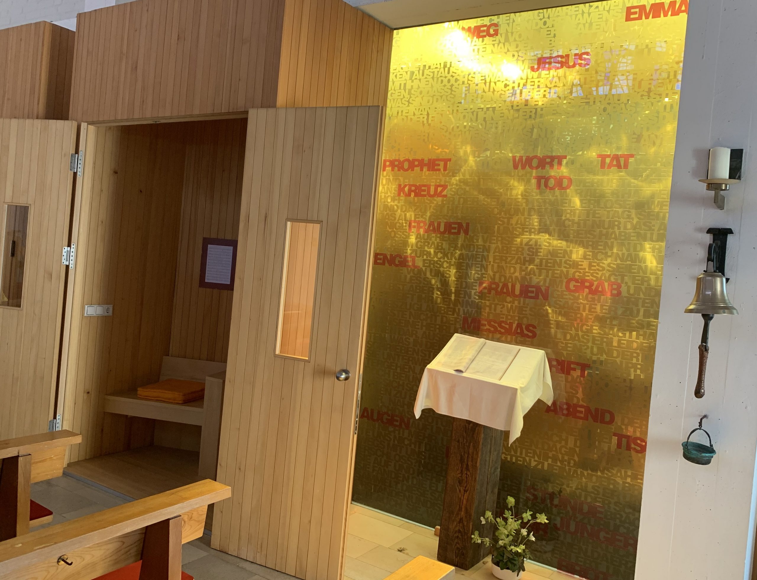 „Wollen wir das gemeinsam versöhnen und wieder gut machen?“, fragte ich ruhig in die Runde. Wir stellten uns gemeinsam rund um den Altar, gaben einander die Hände, blickten in die brennende Kerze, legten die Vergebungsbitte auf den Altar und sangen trotz Pubertät ein Lied. Es klang fest und irgendwie schön, zumindest erleichtert. Wir verneigten uns voreinander und gingen in die Schule zurück. Es klingt kitschig, aber bei manchen hatte ich das Gefühl, dass sie nicht nur innerlich tanzten. Sie waren erleichtert, versöhnt und das eine oder andere wurde auch wieder zurückgegeben. Versöhnt leben, erleichtert, offen und vertrauensvoll leben können ist ein Glück. Genau daran erinnert die „Versöhnung“ in der St. Anna Kirche in Kirchschlag. Bewusst haben wir den Beichstuhl als „Gesprächsplatz“ gestaltet, wo zwei nach vorne schauend miteinander reden können. Es ist mehr ein symbolischer Platz geblieben, eine manifestierte Erinnerung an das Bemühen, im Gespräch der Versöhnung nachzugehen. Umgeben wird der Ort von der Emmausgeschichte, die uns damals Stefan Teufel gestaltet hat. Wir kennen die für mich schönste Geschichte in der Bibel aus dem Leben Jesu. Zwei gehen frustriert, in sich isoliert, in Trauer gefangen nach Emmaus. Da gesellt sich einer zu ihnen. Redet mit ihnen. Erklärt manche Vorgänge. Gibt dem Geschehenen einen neuen Rahmen. Sie verstehen langsam und finden Versöhnung in dieser „besch-eidenen“ Situation. Bleib bei uns. Es ist Abend geworden. Er nimmt das Brot, segnet es und bricht es. Geistesblitz, Mauern fallen, Schuppen von den Augen, ein Aufatmen, eine Begeisterung. „Er ist hier bei uns, mit uns.“ Emmaus ist in die Geschichte eingegangen als Ort, auf den wir zugehen, wo sich auf dem Weg dorthin jemand zu uns gesellen kann, wo sich Versöhnung ereignen kann, wo Hoffnung und neue Begeisterung wachsen können, wo der Tod das neue Leben gefunden hat, finden kann. Der goldene Spalt erinnert daran. Der Platz der Versöhnung krackt in den Spalt hinein, macht dort einen „Buckel“, springt in die Symetrie. Bei allen Koordinaten des Lebens ereignet sich im Gehen sehr oft in den damit verbundenen Zwischenräumen das wunderbare Geschenk der Versöhnung.