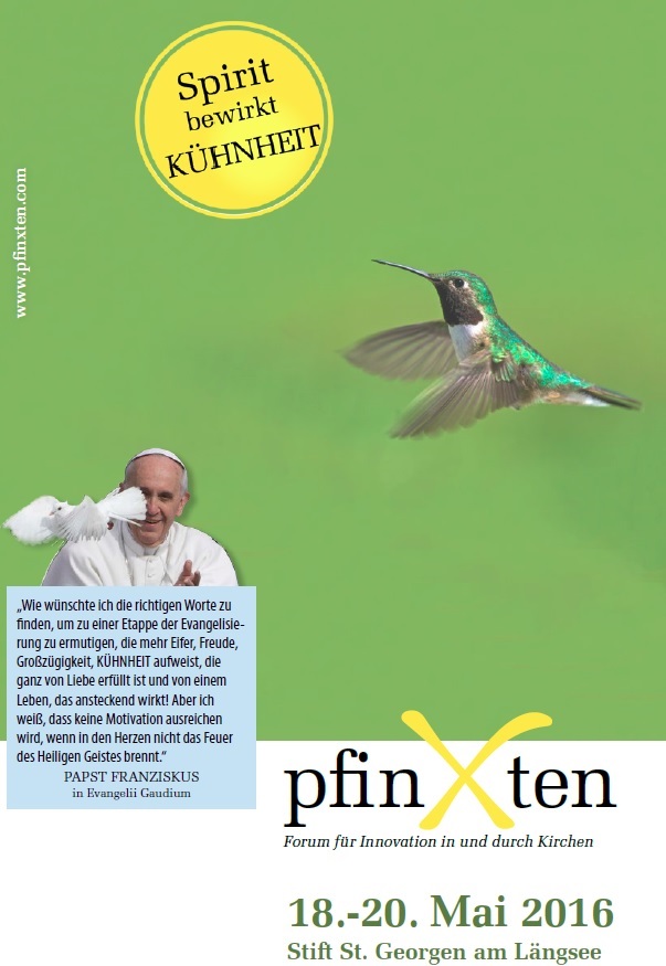 pfinxten1Zum ersten Mal gab es zu Pfingsten 2015 die Möglichkeit, sich überregional, querinstitutionell und ökumenisch zu einem lebendigen Austausch zum Thema Innovation in und durch Kirchen zu treffen. 2016 findet „PfinXten“ zum zweiten Mal statt. Wovon spreche ich? „PfinXten – Spirit bewirkt KÜHNHEIT“ als Forum für Innovation in und durch Kirchen von Mi 18.05. – Fr 20.05.2016 im Bildungshaus Stift St. Georgen am Längsee in Kärnten. Der Pastoralinnovator Georg Plank schreibt: „Erfolgreiche InnovatorInnen aus Kirche und Wirtschaft eröffnen wieder Räume, in denen die Früchte für  Mensch, Kirche und Gesellschaft gedeihen können. Als Key-Note Speaker konnte Chris Wesley von der Church of the Nativity in Baltimore gewonnen werden.Dazu kommen Impulse von Georg Plank, Hildegard Wustmans, Robert Kanduth, Ferdinand Kaineder u.a.“ Schön, als Innovator gesehen und eingeladen zu sein. Schön auch, selbst aus diesem Kreis wieder Inspiration, Kraft und Kühnheit zu schöpfen. Vielleicht sieht man sich?