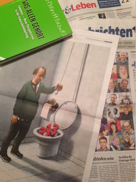 Es mutet schon etwas eigenartig an, wenn ein Mensch sein 2013 einfach durch das Klo hinunterspülen muss. Was sieht dieser Mensch im Rückspiegel auf das Jahr 2013, dass er es über die Kanalisation entsorgen möchte? Ist es der globale Blick auf die Vorgänge in unserer Gesellschaft und Politik, dann fänden wir wahrscheinlich viele Gründe, die einem dieses Jahr vergessen lassen wollen. Leben ist wie Zeichnen ohne Radiergummi. Auch das Jahr 2013 lässt sich nicht ausradieren, wegspülen ins Nirwana der unterirdischen Rohre. Es kommt immer wieder zurück wie uns auch die neue Regierung wieder aufstoßen wird. Selbst in der Kirche glaubte man, Franziskus habe endlich die starre Kurie mit ihrem globalen Herrschaftsanspruch über das Gewissen und die Entscheidung des einzelnen Katholiken überwunden, hinuntergespült. Die Kurie klebt fest und lässt sich nicht bewegen. Gerhard Müller heißt der Glaubenspräfekt und er klebt wöchentlich die alte Kirche fest an der Klomuschel an. Da kann noch so viel frisches Wasser daherkommen. Macht pickt. Seine gestern getätigten Einschätzungen zu wichtigen Themen der römischen Kirche wie Regionalisierung oder Geschiedene lässt vermuten, dass eher der Neue hinuntergespült wird.