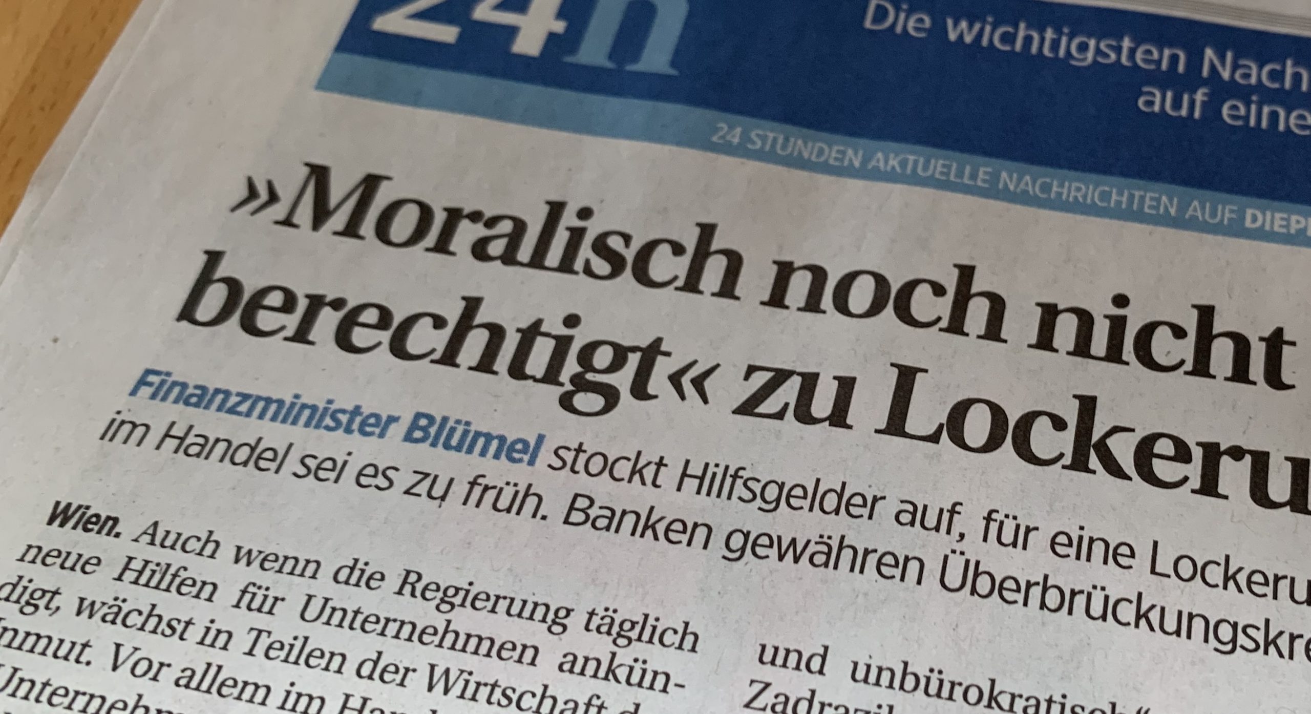 Gestern hat der Jungvater und Finanzminister Gernot Blümel bei der Pressekonferenz eine besondere Redeweise aufgesetzt, um die Journalistenfrage nach dem Zeitpunkt der Lockerungen der Corona-Maßnahmen zu beantworten.  Für mich hat sie etwas von einer „therapeutischer Redeweise“ an sich. Oder wie wir sie auch im Coaching verwenden. Wenn ein Gespräch mit einem schweren Trinker auf das Why seines Trinkens kommt, dann fragen wir auch nicht: Warum trinkst du? Nein, wir stellen eine „moralische Instanz“ in das Gespräch und fragen beispielsweise: „Wer hat dir erlaubt, so viel zu trinken?“ Das löst ganz andere Gedankengänge aus und ermöglicht ein anderes Gespräch als die einfache Frage : Warum?