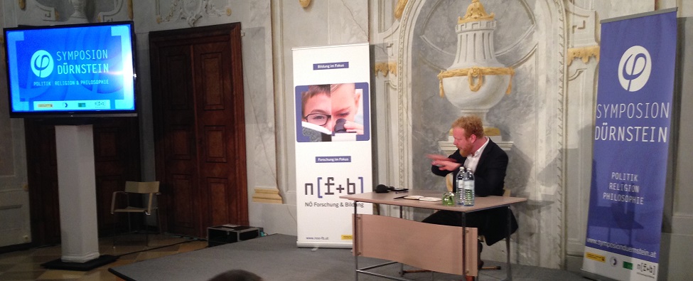 Ein Autounfall hat sein Kommen zum Syposium Dürnstein bis zuletzt in Frage gestellt. Ein Stock ist dem „ökonomischen Rotschopf“ Hilfe beim gehen aufs Podium. Wie immer legt er einen kleinen Notizblick vor sich hin, um darin zu blättern, ohne sich inhaltlich daran festzumachen. Sein Englisch ist klar verständlich. Er beginnt ganz vorne, bei Adam und schließlich bei Eva.