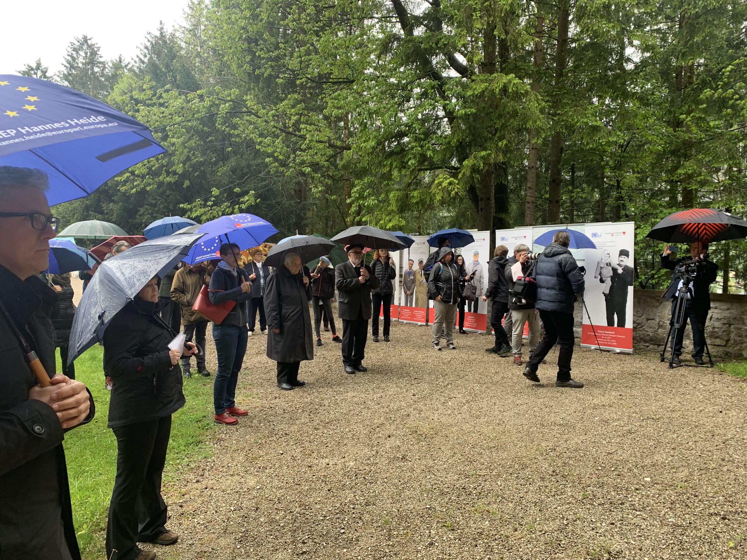 Bei der Fahrt hinüber nach Roith in das ehemalige Konzentrationslager regnet es wieder. „Hier sind die Busse gestanden, die Leute haben sich verabschiedet, sind sich um den Hals gefallen und wir haben gewunken.“ Es ist zu spüren, dass Bischof Aichern wirklich oft da war, um dieser Freundschaft seine Wertschätzung zu zeigen, selber mitzuwirken. Am Friedhof im KZ war eine wegen Covid19 kleine Gedenkstunde. Wir stehen alle da mit Schirmen über unseren Köpfen. Viele öffentlich bekannte Gesichter. Eine kleine Abordnung aus Polen legt einen Kranz nieder. Bei allen Ansprachen in aller Kürze wurde darauf verwiesen, dass die Katastrope nie groß beginnt, sondern ganz klein anfängt. „Wehret diesen Anfängen.“ Junge Studierende lesen Biografien von Überlebenden vor, ebenso von Interviews mit Ebenseern, die man vor Jahren gemacht hat. Es schnürt mir den Hals zu. Ein tiefes Fragezeichen krallt sich durch den Kopf, wozu der Mensch auf der einen Seite dem Menschen gegenüber fähig ist an Brutalität und Verachtung und auf der anderen Seite der Hilflosigkeit ausgeliefert scheint. Meine Gedanken verlassen für einen Moment diesen Friedhof am KZ und gehen zu den Flüchtenden heute, hin zum Domplatz, wo wir in aller Frühe aufgebrochen sind und heute wieder Zelte aufgerichtet werden, in denen Menschen aus Solidarität übernachten, um die Hartherzigkeit aufzuzeigen und aufzuweichen. Die Gedanken kommen wieder zurück und meine Ohren hören an diesem Gedenkort eine Frage, die in mir hängen bleibt: Was gedenkt ihr zu tun?