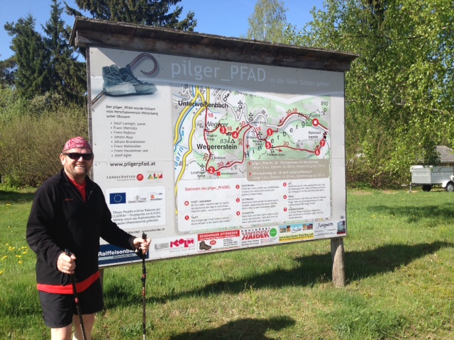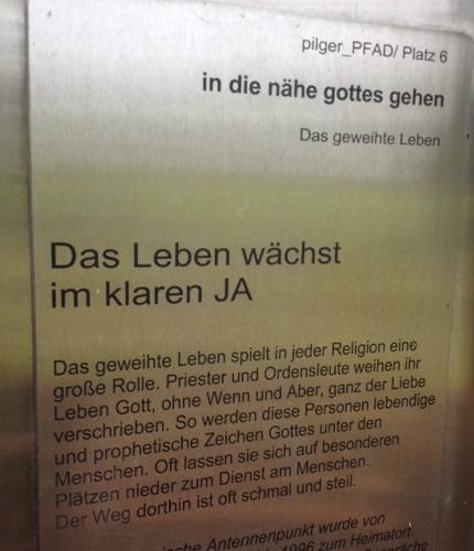Genau genommen ist sechs Jahre her, dass ich den Pilgerpfad zusammen mit dem dortigen Tourismusverein konzipiert und gestaltet habe. Ich erinnere mich noch ganz genau, wie ich mit den Bauern und Anwohnern die acht Kilometer abgegangen bin. Josef Aglas von der Hirschalm war die „treibende Kraft“, dass diese wunderbare Gegend einen spirituellen Pfad bekommt. Heute geht auch der Johannesweg einen Teil am Pilgerpfad. Die Luft und die Gegend ist heute wie geschaffen zum Gehen. Blumenwiesen, die unglaubliche Vielfalt an Grüntönen, die Frühlingsbrise um die Nase und die wärmenden Sonnenstrahlen begleiten uns, kommen uns immer entgegen. In die Nähe Gottes gehen. Zwei Stationen der sieben Sakramente sprechen uns heute besonders an. Die Ehe mit der Übung des „Distanzgehens“ und das geweihte Leben mit der Himmelsleiter. Distanzgehen meint, dass wir ein Stück des Weges getrennt gehen und schließlich wieder „zusammenfinden“. Eine Übung, die uns „alltäglich“ geworden ist, seit ich in Wien und Österreich arbeite. Mit besonderer innerer Neugierde habe ich die Station des „geweihten Lebens“ erwartet. Jetzt, wo ich im Dienste des geweihten Lebens in den Ordensgemeinschaften stehe und gehe, wollte ich wissen, ob ich 2008 auch „richtig und treffend formuliert“ habe. Ich holte tief Luft und sagte nach dem Lesen: Ja, es stimmt. Wir beschließen unseren Weg am Pilgerpfad, einer sonntäglichen Meditation der sieben Sakramente entlang. Abt Werlen schreibt auf Seite 72 ein #Bahngleichnis: „Nur wer sich bewegt kann bewegen.“ Stimmt. Ein bewegender Sonntag.